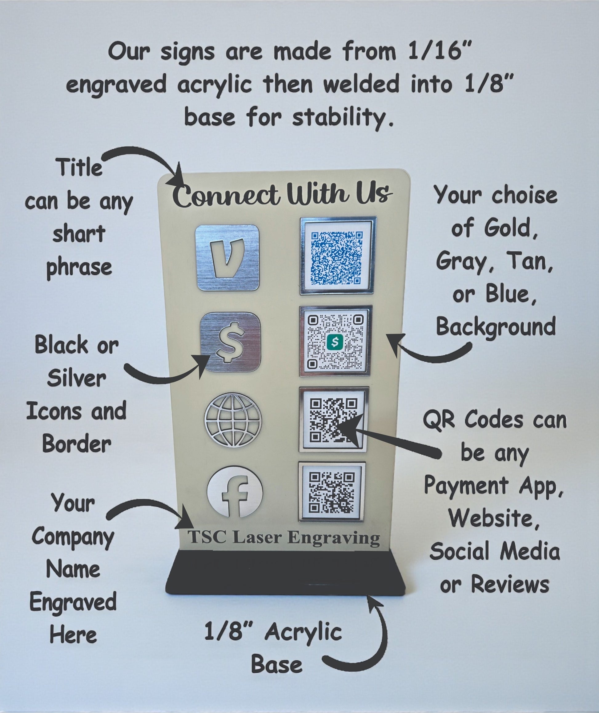 Showcase your business in style with this custom multi-QR code acrylic display sign, precision-engraved by TSC Laser Engraving. Designed for small businesses, boutiques, craft shows, salons, restaurants, and vendor booths. This modern display keeps all your links social media, payment apps, and Google reviews in one clean, professional design.